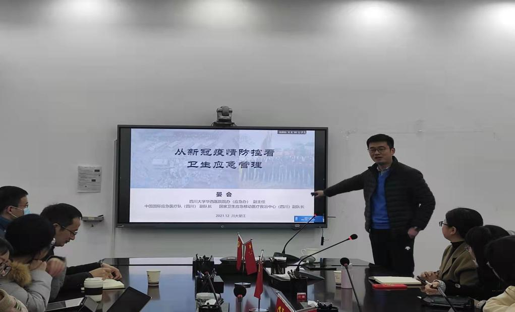2021年12月9日上午9:00,公海gh555000aa线路检测中心华西医院院办(应急办公室)副主任晏会副教授应邀到访公司,在学院 311会议室为公司师生作了题为《从新冠疫情防控看卫生应急管理》的专题讲座,该讲座是公司“应急管理实务专家讲堂”的第2期活动,应急管理硕士点衡霞教授、李强彬教授和二十多名本硕博同学参加了此次讲座。