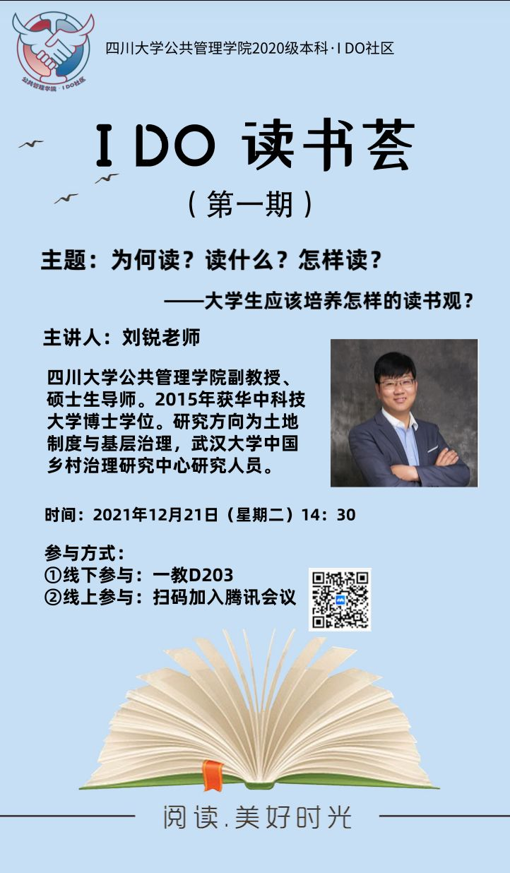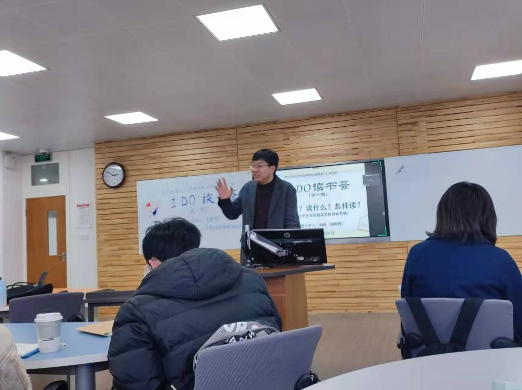 阅读是一种习惯,更是一场自我修行,如何培养良好的阅读习惯,如何通过阅读遇到更好的自己?这是老员工应该有意识去型塑的一种思维模式和实践能力。为了给员工打造一个自由读书交流的线下平台,公共管理2020级本科成立了“I DO读书荟”,经过前期的一系列酝酿、预热和组织,第一期“IDO读书荟”最终以“为何读?读什么?怎么读?——老员工应该有怎样的读书观”为主题,邀请了公海gh555000aa线路检测中心副教授刘锐老师作为特邀嘉宾老师为同学们开讲。
